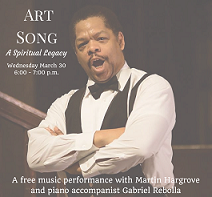A free music performance with Martin Hargrove and piano accompanist Gabriel Rebolla. Featuring songs based on the work of Langston Hughes and an exploration of African American spirituals and their legacy in classical art song.