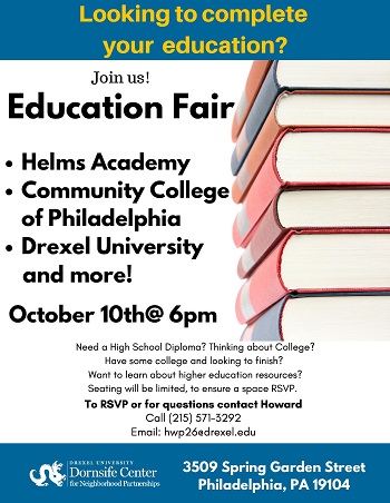 Need a high school diploma? Thinking about college or looking to finish? Join us on Oct 10, 2019 from 6:00 to 7:30 p.m. for an education fair with the Helms Academy, Community College of Philadelphia, Drexel University, and more! Seating will be limited. To RSVP, please contact Howard at 215.571.3292 or hwp26@drexel.edu