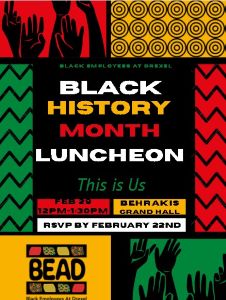Join Black Employees at Drexel (BEAD) for their annual Black History Month Luncheon on Feb. 29 from 12-1:30 p.m. in Behrakis Grand Hall. Please RSVP by Feb. 22.