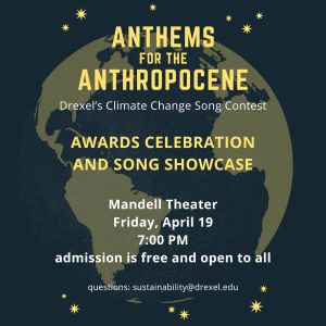 Please join us for the awards ceremony and song showcase for ANTHEMS FOR THE ANTHROPOCENE, Drexel's annual climate change song contest! We'll share each contestant's song and announce top awards. Come and show some love to our Drexel songwriters!