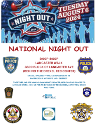Drexel Public Safety will once again be hosting National Night Out (NNO) on August 6, 5-8 p.m., an evening of resources, activities, music and food. NNO enhances the relationship between neighbors and law enforcement while bringing back a true sense of community. This event also provides a great opportunity to bring police and neighbors together under positive circumstances.