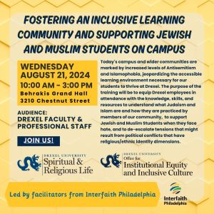 Today's campus and wider communities are marked by increased levels of Antisemitism and Islamophobia, jeopardizing the accessible learning environment necessary for our students to thrive at Drexel. The purpose of the training will be to equip Drexel employees in attendance with the knowledge, skills and resources to understand what Judaism and Islam are and how they are practiced by members of our community, to support Jewish and Muslim Students when they face hate, and to de-escalate tensions that might result from political conflicts that have religious/ethnic identity dimensions.