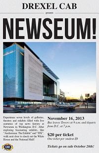 We will be leaving Towers Hall at 9:00 AM on November 16th and returning from Washington, D.C. at 7:00 PM. $20 a ticket/ 1 ticket per undergraduate Drexel student ID. Ticket includes transportation and admittance to Newseum. Ticket sales start October 28th at 5:30 PM at the CAB office. Bus transportation to and from the event will be provided and must be taken.