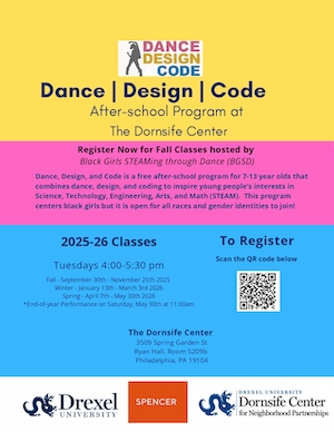 Dance, Design & Code is a free after-school program for 7 - 13-year-olds that combines dance, design, and coding to inspire young people's interests in Science, Technology, Engineering, Arts, and Math (STEAM).  This program centers black girls, but it is open for all races and gender identities to join!