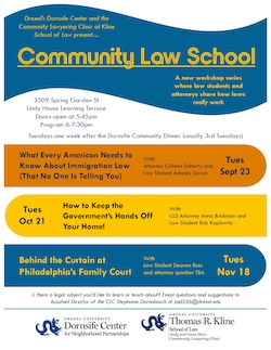 Drexel's Dornsife Center and Kline School of Law present Community Law School! A new workshop series where law students and attorneys share how laws really work! Each session will be held the Tuesday following community dinner (usually the 3rd Tuesday of the month) and focus on different areas of the Law.