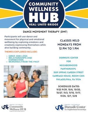 Join us for Dance Movement Therapy (DMT).  Participants will use dance and movement for physical and emotional well-being by exploring emotions, creatively expressing themselves, while also building community.