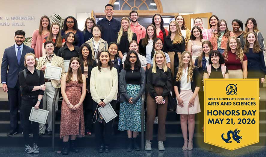 As the annual Honors Day celebration demonstrates, the Drexel University College of Arts and Sciences is home to many of Drexel’s finest students. Our community applauds these scholars recognized by their peers, faculty and national fellowships committees for these distinctions. Faculty nominate many students recognized at this ceremony based on their contributions in the classroom, the lab and the community; others have written essays or theses that department committees selected. All have maintained impressive records that set them apart from their peers.