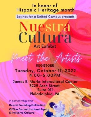 Event Description The exhibition Nuestra Cultura, located at the James E. Marks Intercultural Center, aims to showcase some of the work by a group of Westphal undergraduate Latinx artists in an effort to bring awareness to the Latine Identity while also encouraging other Latinx artist to be proud of their roots during Hispanic Heritage Month and beyond. The art exhibition is open to the public until October 31, 2022.