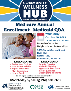 Join us at the Dornsife Center, Community Wellness Hub for the Medicare Annual Enrollment-Medicaid Q&A on Wednesday October 18, 12:30PM-2:00PM