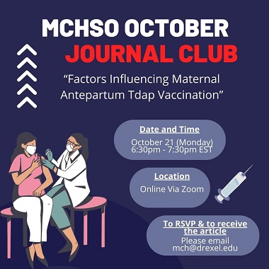 All are welcome to join the MCH Student Organization (MCHSO) and the MCH Program for a virtual MCH Journal Club where we will discuss the factors influencing pregnant women’s decisions to receive the Tdap vaccine.