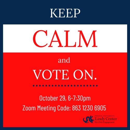Event Description Anxious about the upcoming election? We want to help - join the Lindy Center for Civic Engagement for an evening of healing and channeling anxiety into action. We'll start with some physical movement you can do in your chair, then special guest Sandy Vogel, Assistant Director for Penn’s Program on Opinion Research and Election Studies, will provide some insight into what might be making us anxious about the election and what we can do, and finally we'll spend some time writing letters to our future selves post-election to remind us of what we care about and how we can continue fighting for liberation no matter the results. Thursday, October 29th, 6 to 7:30pm, Zoom meeting code: 863 1230 6905. |