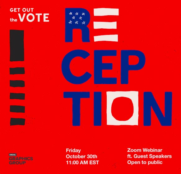 On Friday, October 30th from 11:00am-1:00pm ET., we are going to be holding a virtual reception for the Get Out the Vote poster competition. Three special guests with experience in activism in design will present, and the winners of the poster competition will be announced! This is open to the public so anyone is able to join! More details to come...