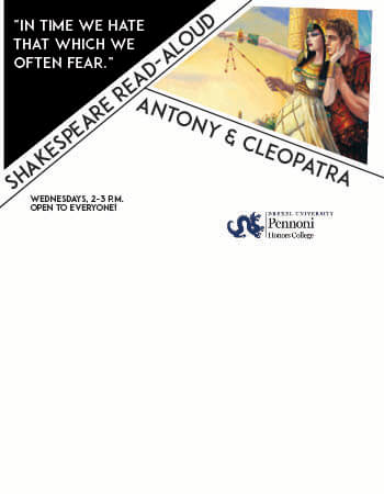 The Pennoni Honors College would like to invite you to another Shakespeare Read-Aloud for all interested students, staff, faculty, parents, and friends of the Pennoni Honors College. We will be reading and dissecting Antony & Cleopatra.