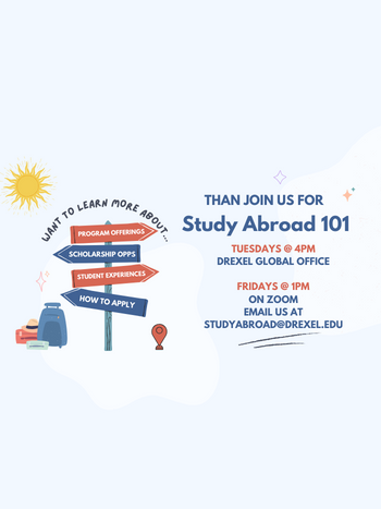 This fall term, Study Abroad 101 presentations will be held in-person on Tuesdays at 4:00PM EST, and on Fridays at 1:00PM EST via Zoom. You can join the Zoom sessions at this link here (you must be signed in to DrexelOne to join).
