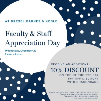 On Dec. 20, from 9 a.m. to 5 p.m., Barnes & Noble Drexel University Campus Bookstore at University City (3250 Chestnut Street) will host an all-day Faculty & Professional Staff Appreciation Day. Faculty and professional staff receive an additional discount of 10 percent off (in addition to the typical 15 percent off); you must present you DragonCard and make your purchase in-store at 3250 Chestnut St. Other restrictions may apply; see store for details.