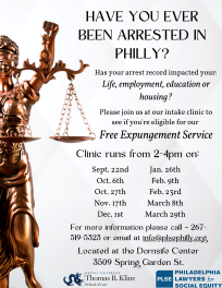 Event Description Has your arrest record impacted your life, employment, education or housing? Join us at the Dornsife Center for our intake clinic to see if you're eligible for our FREE EXPUNGEMENT service. |