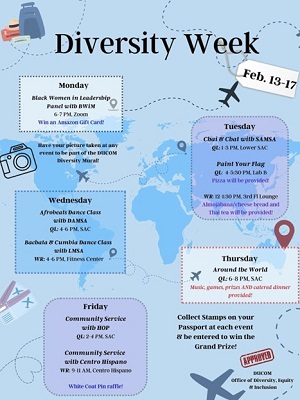 Save the date and gather your passports! The Office of Diversity, Equity, and Inclusion is proud to present the 2023 Annual Diversity Week 2/13 - 2/17.