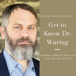 Please join the Drexel ASCE this Thursday, February 18th at 4 p.m. via Zoom fir their event, "Get to Know Dr. Waring," the new department head for CAEE.