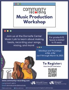 Taught by Drexel students, these workshops introduce youth to modern music recording and production techniques. Offered in a lab setting, this program encourages creativity and fosters music and computer recording proficiency. Join us at the Dornsife Center Music Lab to learn about making beats, recoding your songs, mixing, and more!