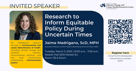 The Drexel Climate Change and Urban Health Research Center (CCUH) is honored to host Dr. Jaime Madrigano, who will join us with a talk titled "Research to Inform Equitable Policy During Uncertain Times" and will answer questions afterward.