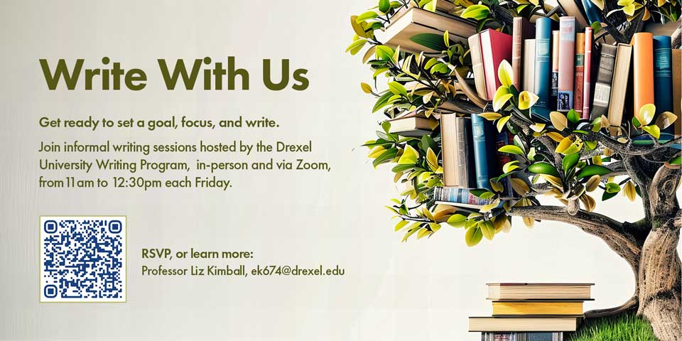 Join us each week for dedicated writing time, in person or on Zoom. Protect your time, move your project forward, and maybe find joy in the company of other writers. We are an inclusive group of faculty and staff from across the university.To join, contact Liz Kimball at ek674@drexel.edu. Sponsored by the Drexel University Writing Program and the Social Science and Humanities Research Council.