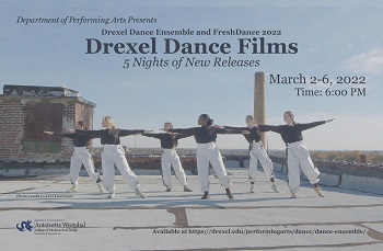 "Five Nights of Dance Films" is a series presented by the Drexel Dance Ensemble and FreshDance companies. The film series showcases five unique works, reflecting on themes of Afro-Futurism, Feminism, life and death, our relationship to nature, and more. Choreographers explore additional elements in these works, including the commissioning of original sound, incorporating natural textures, and interactive wearable technology.