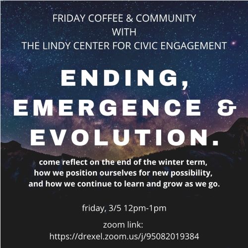 Event Description The Lindy Center for Civic Engagement's final Coffee + Community reflection of the winter 2021 term will focus on Ending, Emergence, & Evolution - where we are as this term comes to a close, how we position ourselves for new possibility, and how we continue to learn and grow as we go. All are welcome to join this open discussion, where we'll pose reflection questions and encourage personal stories and ideas.