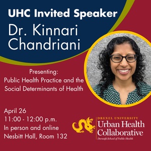 The Drexel Urban Health Collaborative is pleased to host our final invited speaker of 2023, Dr. Kinnari Chandriani, Director of the Philadelphia Department of Public Health's Division of Chronic Disease and Injury Prevention. Dr. Chandriani will present Public Health Practice and the Social Determinants of Health and will be available after the talk for a brief discussion.