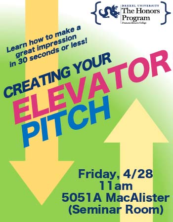 Event Description Learn how to make a great impression in 30 seconds or less! Students will work on refining their “elevator pitch,” a short statement of their work and goals, to prepare for interviews and networking events. |
