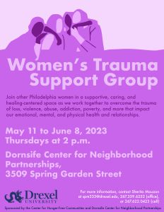 Join other Philadelphia women in a supportive, caring, and healing-centered space as we work together to overcome the trauma of loss, violence, abuse, addiction, poverty, and more that impact our emotional, mental, and physical health and relationships.