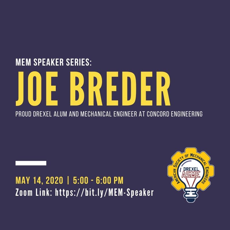 Do you feel unprepared for life after Drexel? You're not alone, but luckily a former Drexel student can help you with knowing what to expect. Join ASME for a chance to speak with Joe Breder, a Mechanical Engineer working at Concord Engineering, about his transition from coops at Drexel to becoming an engineer in the field.