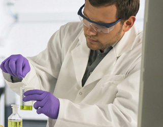 A student wearing a lab coat, goggles and gloves at a lab bench