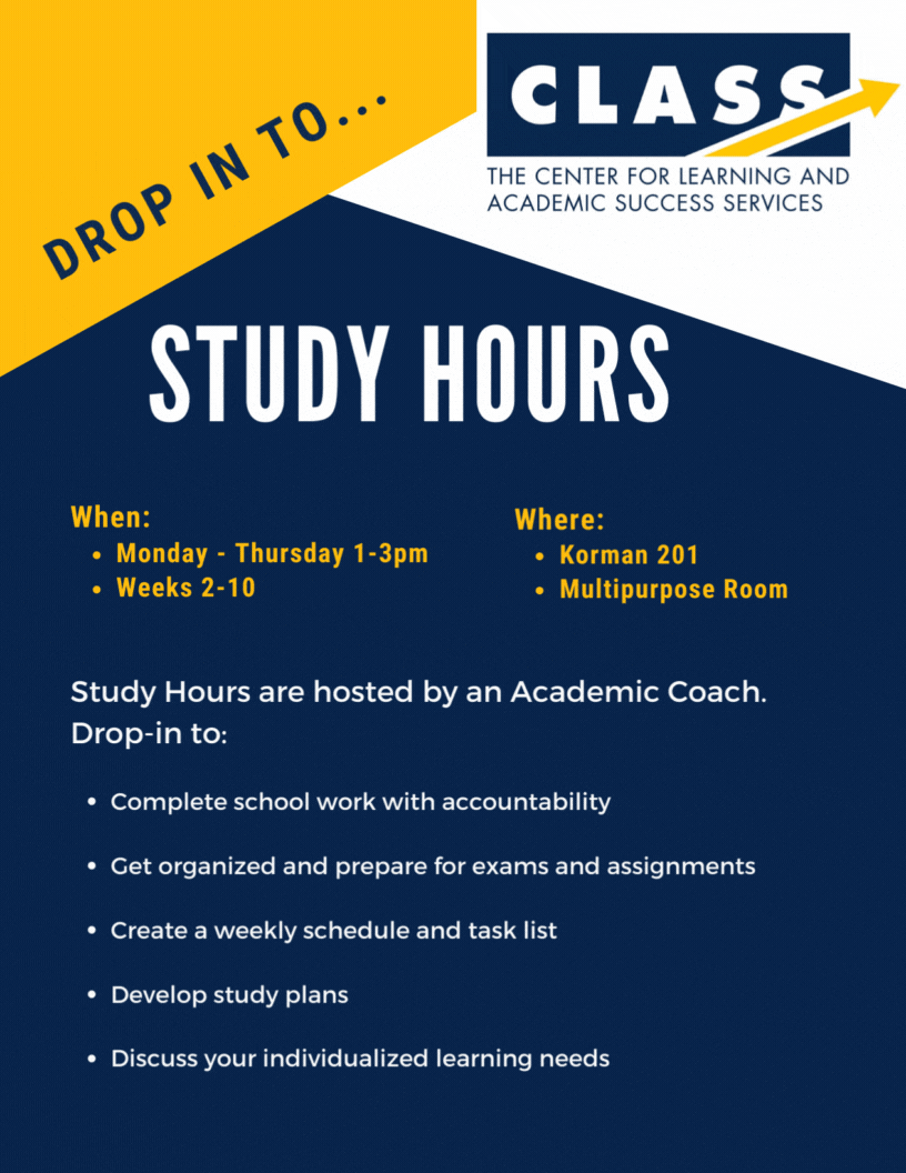 Meet with an academic coach, no appointment needed, to discuss academic skills! Study hours is also a space to get work done with extra accountability!