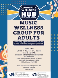 Music wellness group for adults.  Come sing and play instruments to de-stress, socialize, and express yourself!