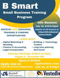 Receive free coaching, training and funding opportunities. Learn about digital marketing and branding, finance and accounting, legal incorporation, building a technology toolbox, long-term planning and more!