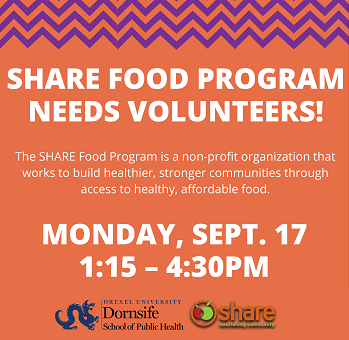 Volunteer with Dornsife during Orientation at Share! The Share Food Program is a non-profit organization that works to build healthier, stronger communities through access to healthy, affordable food. Please RSVP to reserve your spot, as spacing is limited to 30 students. Transportation is provided. Meet in lobby of Nesbitt Hall by 1:15PM.