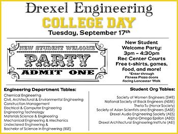Event Description Greet the new engineering students at our Welcome Party at the Rec Center Courts. There will be representatives from academic departments and student organizations, as well as games, food and free t-shirts. Enter through the Fitness Plaza doors facing Lancaster Walk. |